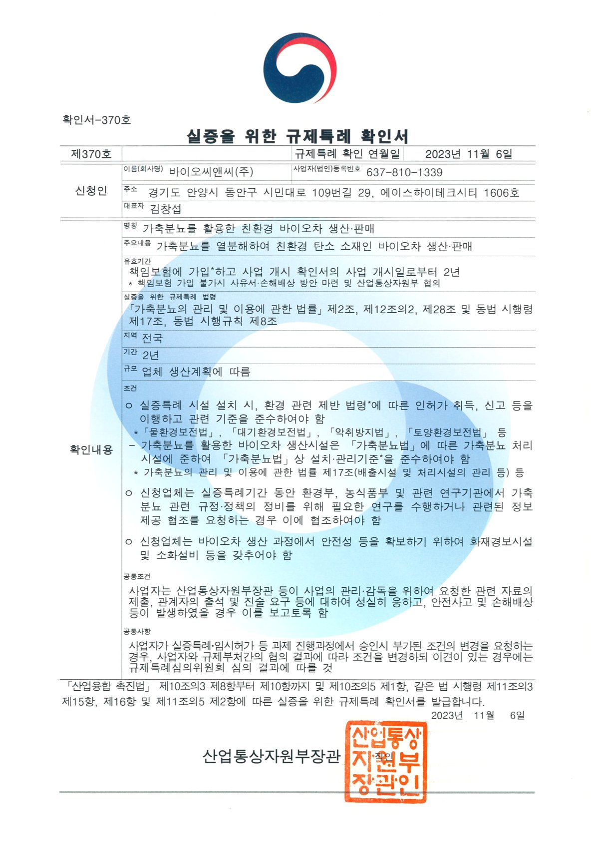 당사는 본 실증시범사업을 성공적으로 완수하여 환경부 녹색기술과 조달청 혁신제품을 인증받고 가축분바이오차의 농업적용실험을 통하여 최종 소비자인 농민들로부터 폭발적인 호응을 얻고 재구매 요청을 받고 있습니다. 또한 경북 의성 공장에서 발생하는 10년치 탄소 Credit을 기아자동차와 신한투자금융에 각 50%씩 선 판매한 바 있습니다. 그리고 당사는 농진청에 가축분바이오차 비료공정규격 신청을 통해 "비료관리법"에 가축분바이오차를 유기질 기타 비료로 포함시키는 법률개정을 고시(24년4월2일)하게 되었고, 산업통상부 규제샌드박스 실증특례확인을 통해 환경부 "가축분뇨 관리 및 이용에 관한 법률"을 국회의원 입법발의로 개정 중에 있습니다.