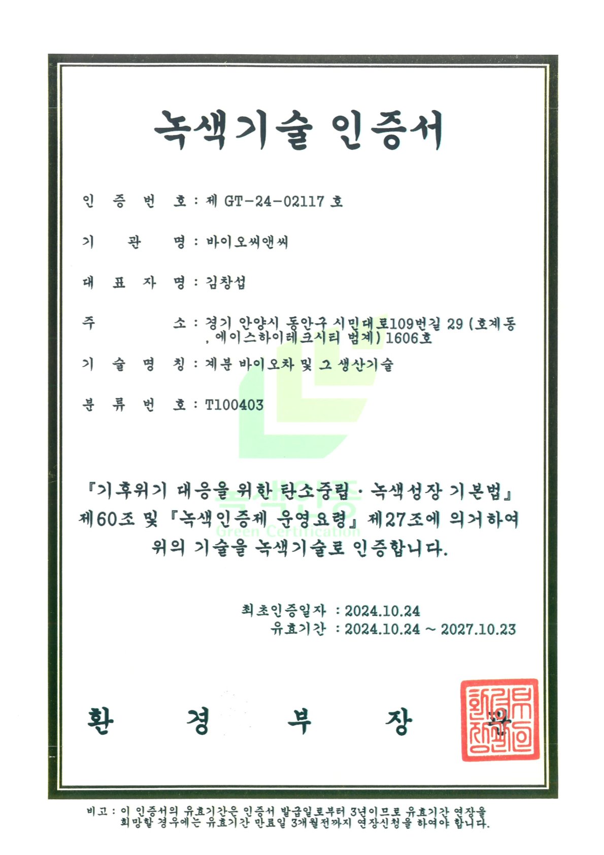 • 환경부 녹색기술제품 인증 취득