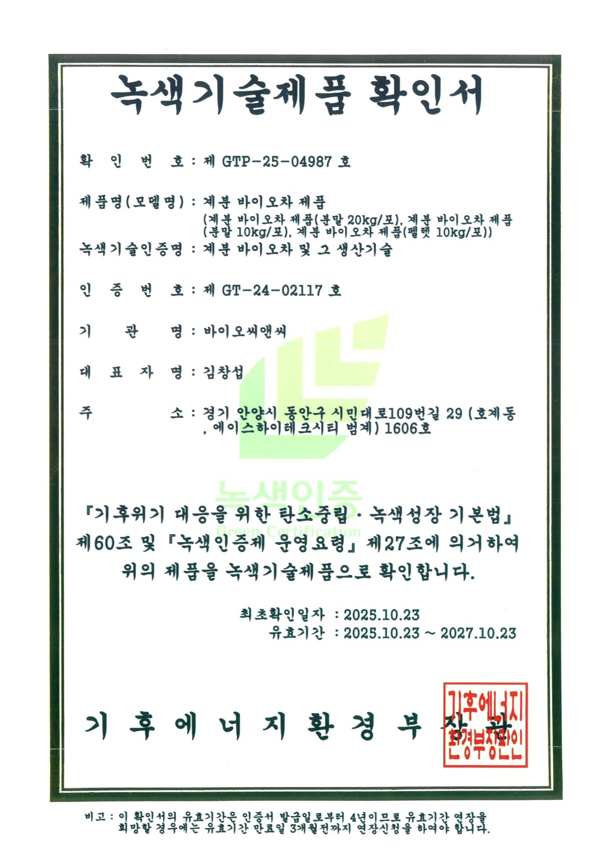 • 기후에너지환경부 녹색기술제품 인증 획득